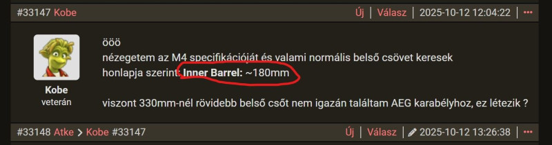 honlapja szerint: Inner Barrel: ~180mmviszont 330mm-nél rövidebb belső csőt nem igazán találtam AEG karabélyhoz, ez létezik ?