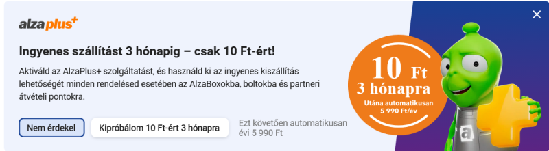 "90 napos AlzaPlus+ tagság 10 Ft-ért majd automatikus megújítással 5 990 Ft évente"