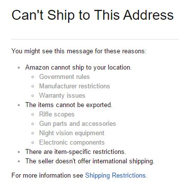"Sorry, this item can't be shipped to your selected address. Learn more. You may either change the shipping address or delete the item from your order. You can also see if this item is available to ship to your address from another seller."