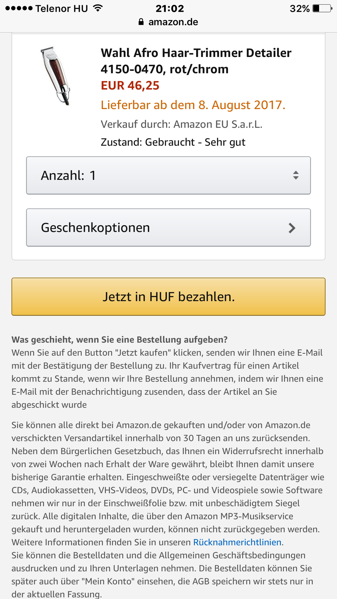 Német amazonról rendelnék egy terméket, azonban címre híbát ír és nem engedi megvenni: "