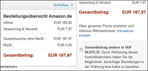Valaki meg tudná erősíteni, hogy ha a német amazonról rendelek egy órát német seller-től Magyarországra akkor tényleg nem lesz semmilyen extra költségem (áfa vagy vám)? Azért kérdezem mert találtam egy órát ami még szállítással együtt is jóval olcsóbb mint itthon viszont a fizetésnél nem látom sehol az ÁFÁt, ld. csatolt kép MwSt.: 0.