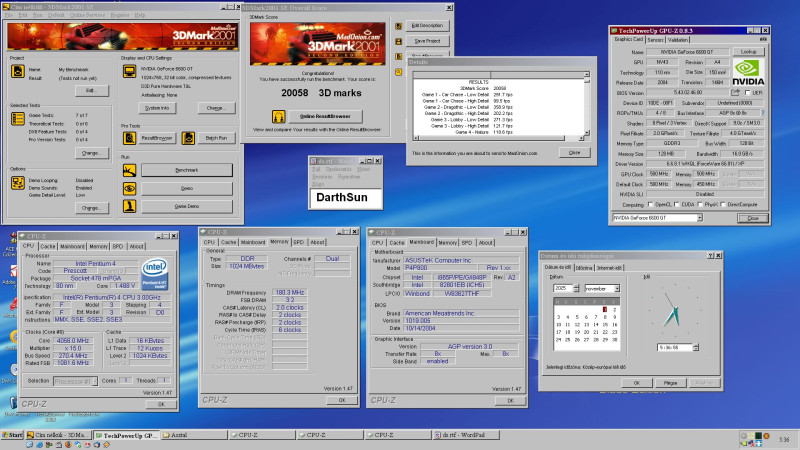Perpill a gépben a CL2- es Geil- ek, frekiben korlátozottak, de marha fürgék. Meglátjuk hogy 4GHz felett mennyire bírják az AGP 6600GT mellett. Nem tudni, ezt még nem próbáltam le, a R9600TX mellett xarrá tuningolva is bírták.