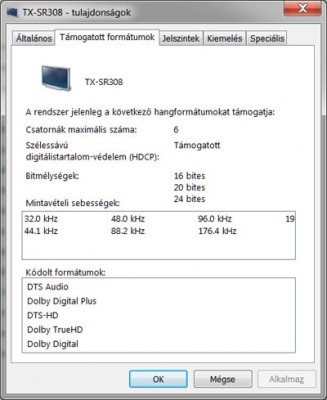 A hangszóró beállításainál ha tesztelem, a két hátsó hangszóró hangja is a jobb és bal elsőnél szólal meg. Másik probléma, hogy a DTS-HD MA és Dolby True-HD sem megy át rajta, pedig a tulajdonságok szerint támogatja. (Csak sima DTS-t ír ki az erősítőm)