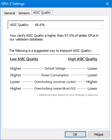 Nem kell linkelni ott van a GPU-Z ablakban is...ASIC Quality a chip minőségét mutatja, hogy mennyire sikerült jól az adott chip. Jobb minőségű chipnek nem lesz magasabb szivárgása mint a gyengébbnek...