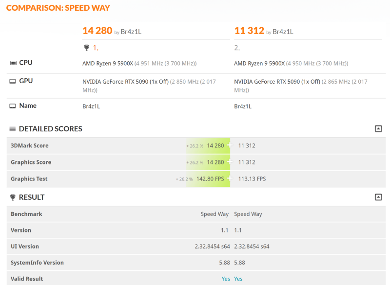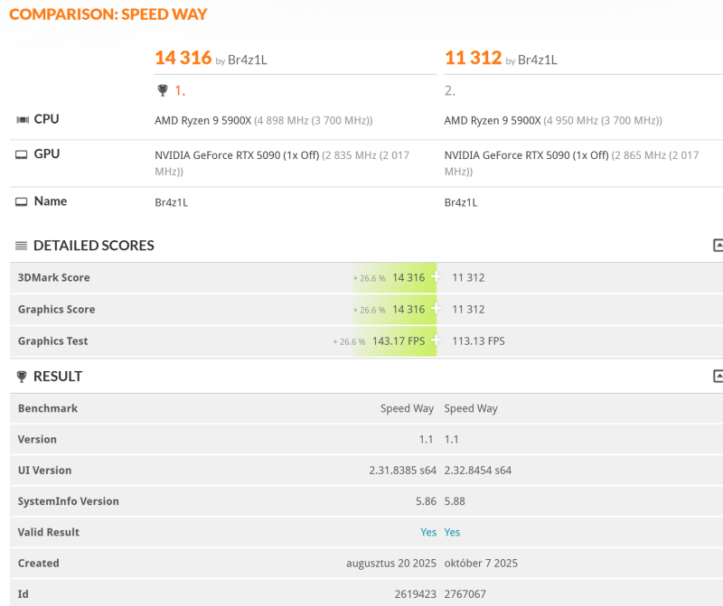 Frissült a gépem 24h2 ről 25h2 re, illetve a 3d mark is kapott egy updatet és kiváncsiságból megnéztem újra a korábbi tesztet és nagyon meglepődtem... Mások is tapasztaltak ekkora teljesetmény veszteséget vagy maga a 3D Mark "app frissülés 5.86-5.88" miatt veszitettem 26% boostot? A 14 316 os eredmény még a 4090 - 5090 ről történt váltáskor mértem augusztusban, ami most csak 11 312..