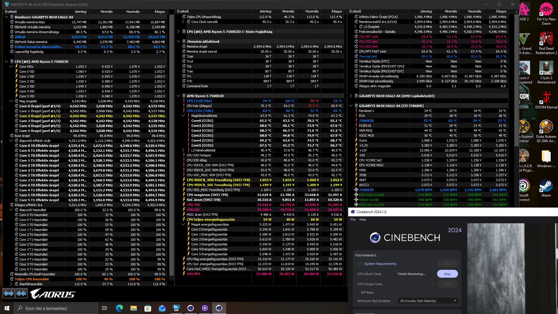 7800x3d vs 9800x3d: előbbi tök jó lenne, de használom hobbimunkára a gépet is (pl videóvágás egy projekt miatt) és a mostani 7700 curve optimizerrel+200mhz 5,5ghzre boostol és 5,1 ghz felett van a többszálas terhelés is, így a játékon kívül minden másban veszítenék a 7800x3dvel.