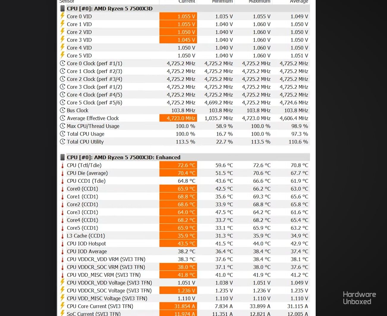 Finally, out of interest, we also overclocked our retail 7500X3D sample. We applied a positive 200 MHz boost alongside a negative voltage offset of -15; pushing this to -20 caused system instability. This configuration increased the all-core frequency to 4,725 MHz in the Cinebench multi-core workload – a 7% frequency uplift with no change in power consumption. -