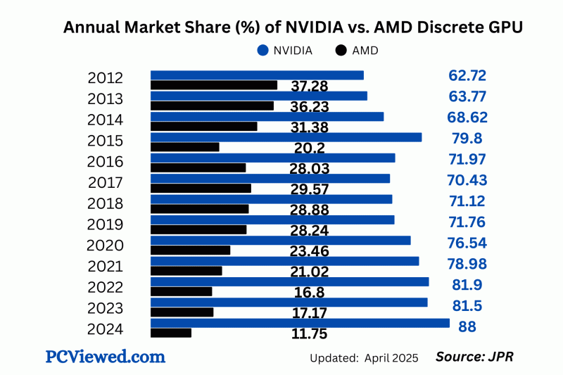 Ryzen-nél is az első 3-4 generációban még az Intelt vették jobban, de a folyamatos jó generációk miatt végül bevitte az AMD az ütést. Az RDNA5 (UDNA) és 6-nak (UDNA2) is az RDNA4-hez hasonlóan jól kell sikerülnie, ha 40%-os market share-t akarnak, ahogy mondta az AMD. -