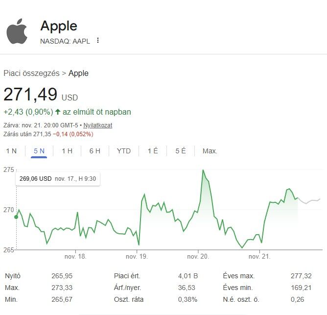 Ok, akkor viszont vegyük ki ezt a részvénypiaci esést, hogy a tényleges dolgokat lássuk. Tehát ha kivesszük a november 20-ai hegyet a képletből, akkor az NVIDIA -3,95%-ot csökkent, míg az Apple 0,9%-kal nőtt, tehát az NVIDIA által közölt rekord negyedéves eredmények úgy látszik, hogy nem hatottak semmit a befektetőkre.