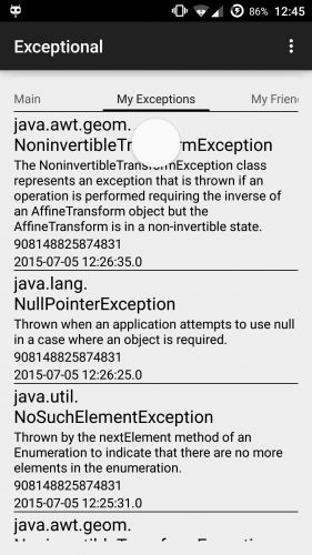 Egyébként azt akarom majd megvalósítani, hogy a legutolsó 30 exceptiont tárolom az eszköz SharedPreferences-ében, és ha lejjebb görget a felhasználó, akkor elkezdi fetchelni a többit a szeverről. Ha van neki 1000 exception-je tárolva a szerveren, és elkezd lefelé görgetni, mint állat, akkor mennyit cellát érdemes egyszerre a memóriában tartani?