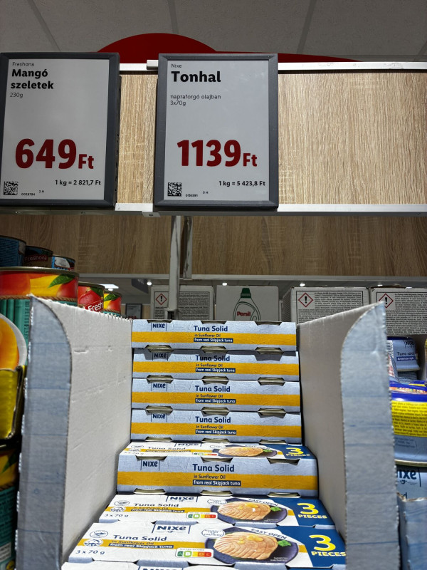 Alacsony nehézfémtartalmú skipjack tuna. (Csíkoshasú tonhal, megvan magyarul is.) Ez a legjobb tonhal, és ilyen áron az egyik legjobb diétás kaja. Van natúr is, olaj nélkül.
