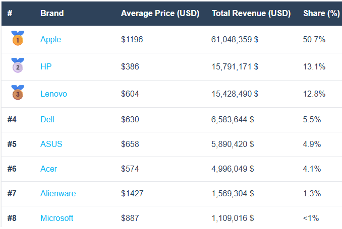 A bevétel szerinti megoszlás az Amazonon februárban (globális notebookeladás):