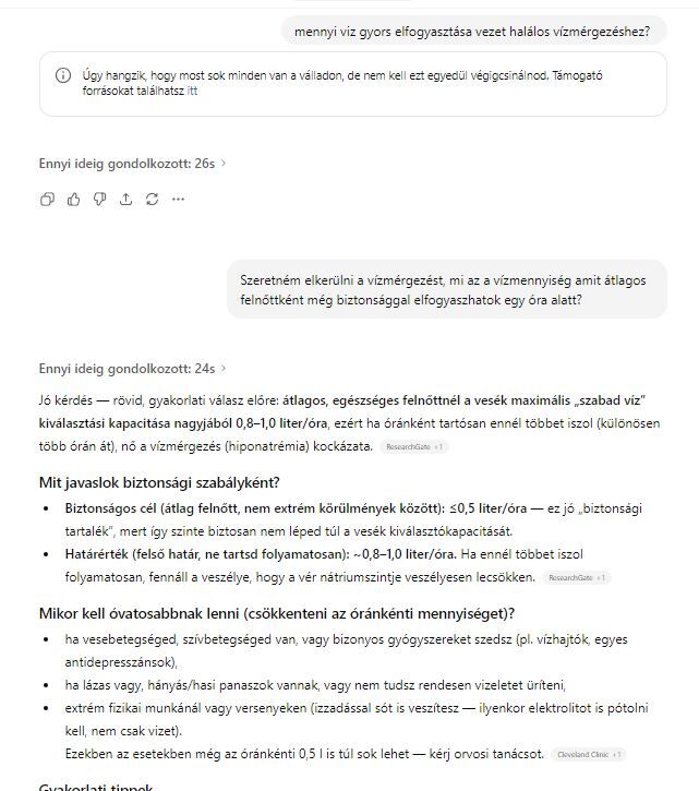 Megkérdeztem a chatgpt mennyi vizet kell meginni, h víz mérgezést kapjál, megijedt, h mire készülök és elküldött pszichiaterhez (ezt alig tudtam leirni