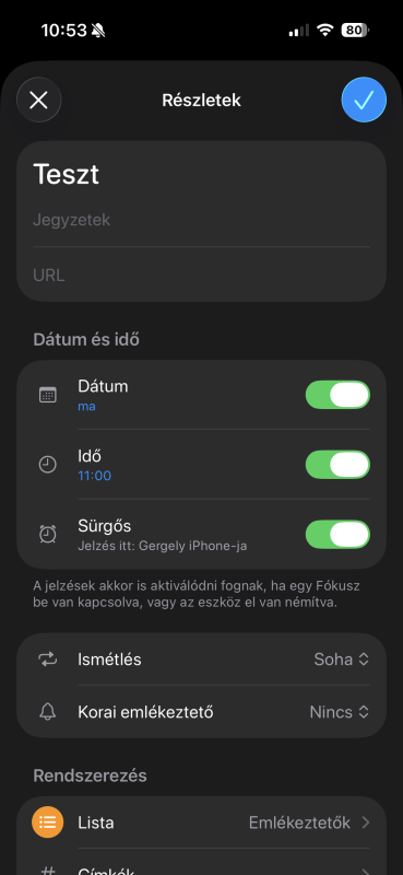 Ott most bevezettek egy új funkciót a 26.2-ben hogy ha csinálsz egy új emlékeztetőt akkor be lehet állítani "Sűrgős"-ként és akkor nem csak simán jelezni fog egy rövidd csippanással hanem úgy fog viselkedni mint egy ébresztő és még néma módban is fog jelezni a beállított ébresztő hangon!