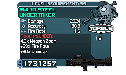 jó cucc,csak sajna nincs elemental rajta,nomeg a gyakorisága látszik az árán is,lásd hiába pearl,a revolver értéke sokkal nagyobb.meg amiért haragszok,hogy a rakétavetők nem igazán használhatók,mert találni kell vele,lassú,hiába a 2300+90% sebzés,a revolverem is hoz majdnem ennyit,és ahhoz több lőszer is spájzolható,a reload is sokkal gyorsabb,és maga a lövedék is "azonnal" ott van,ahova célzok.viszont ezzel csoport közé lőni jó dolog,főleg az alapjátékban,avagy a lépegetők ellen,azok nem mozognak gyorsan,fejre kell lőni vele -
