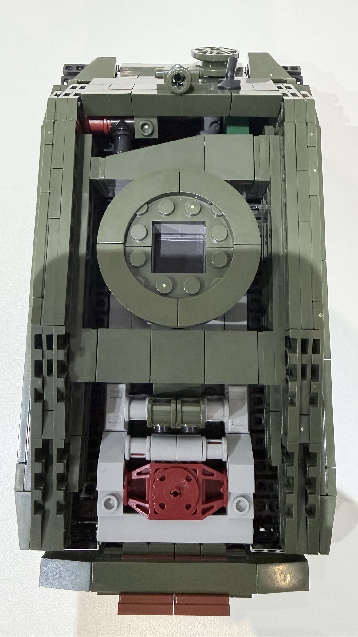 Magán a lövésztornyon nincs nyilás, levehető egyben. A hátsó rész a motor. Viszont van fun funkció is. Elől egy kerék van, ha forgatom, körbeforog a a torony. Lánctalpak is faszán forognak. A tervem az, hogy az összes tankot beszerzem, de csak ki lesz rakva valahova, más nagyobb dologra már nincs hely. -