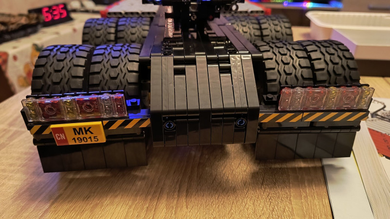 Az alternatív gyártók készleteinél már megszokhattuk, hogy a LEGO-val ellentétben legtöbbször az összerakási útmutató végén mutatják meg, hová kell a matricákat felragasztani. Nos, szerintem sokkal nehezebb az elkészült modellt utólag felmatricázni, mint építés során magára az elemre felrakni, mielőtt beépítjük. Szóval itt is úgy tettem. A rendszámtábla és a lökhárító sárga-fekete csíkozása is matricával lett megoldva, szóval én már most, építés alatt felragasztottam őket a megfelelő helyre.