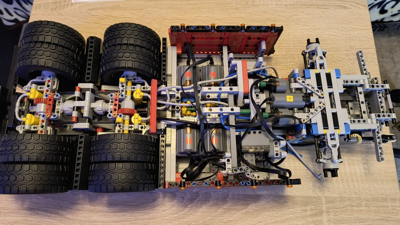 A négy nagy XL motor a hátsó tengelyeket hajtja meg, ezek mozgatják majd a kamiont előre és hátra. Az L motor sűríti a levegőt a pneumatikus rendszerbe, ezzel lehet majd dönteni a fülkét, a felfüggesztéseket emelni és süllyeszteni, stb. (Valamint, ha lenne pótkocsi, ez működtetné a gólyalábakat, és a rámpát is, amin a szállítandó jármű felhajthat a trélerre.) A három szervómotorból egy az első tengely kormányzására, kettő pedig a funkciók közötti váltókarok működtetésére szolgál. Mivel csak egy motor préseli a levegőt a rendszerbe, így ezekkel a karokkal állítjuk be, hogy a sűrített levegő épp melyik funkciót működtesse a vontatón.