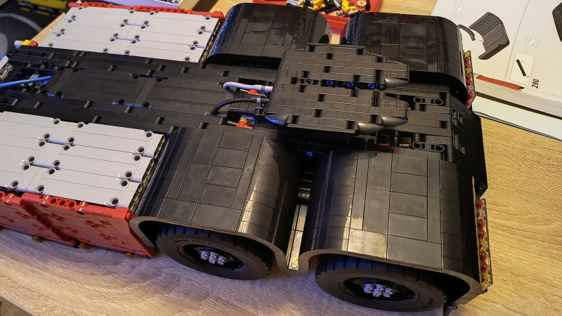 Építés szempontjából nem túl bonyolult ez a rész, egyedül a pneumatikus csövek bekötése okozott gondot, néhol eléggé szűk helyeken kellett őket csatlakoztatni, de ettől eltekintve tényleg semmi gond nem volt velük. Ha elkészül a két tengely, össze kellett őket kötni (a csatlakozókat is fémre cserélték), majd hozzáépíteni a már elkészült részhez. Itt lehet nagyjából érzékelni, milyen nagy modell lesz, hiszen ez még csak az alsó rész, még jön rá a fülke, hátulra meg az egész felépítmény... Durva lesz.