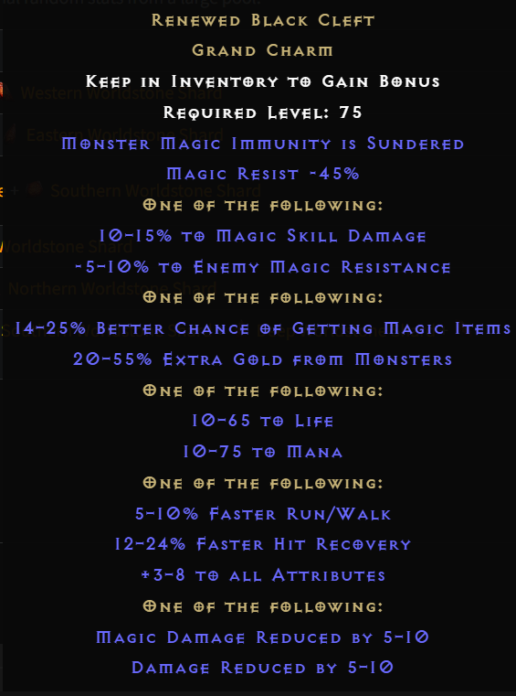 de amit pluszban tehet a charmra, az sweet, pl. +15% damage + 65 life + 24 fhr, és a damage reduced by 10 sem rossz dolog, valszeg nem 1-2 Ist lesz az ára, ha egy ilyen roll összejön valakinek
