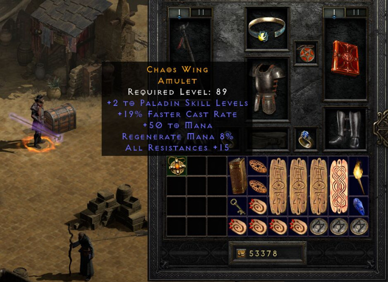 5 perccel a vége előtt dobott valami egy Lem rúnát - az ezt követő legmagasabb szintű rúnám, ami esett, az a Lum. Cuccból is csak a szemét potyogott; Hell Act3-ban esett egy négylyukú colossal volgue, meg még Nightmare vége felé egy skin of the serpent magi, és ezzel úgy ki is lőttünk mindent. Na jó, még esett egy Steelskull sisak, ami MF-be öltözéshez jó lehet egy darabig, ha a rezisztek és + skill hiányát máshol pótolni tudja az ember. Jellemző, hogy még a játék végén is négy kék cucc volt rajtam (amu és két gyűrű - ezek az FCR miatt + egy WL könyv, amit egyszerűen lusta voltam lecserélni akár valami egyszerűbb rúnaszavas pajzsra.)