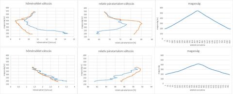 A mai mérésnél (a felső diagramsor) jól látszik, hogy az első inverziós réteg fölé emelkedtem. Addig pl. a hőmérséklet fokozatosan csökken a magasság növekedésével, aztán úgy 200 méter környékén elkezd növekedni.