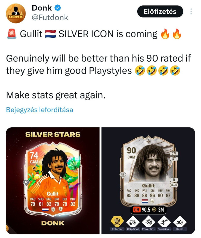 Es akkor erre jon meg ra hogy top gold vagy akar hasznalhato promo lapot iden meg sokkal nehezebb nyitni mint korabban. Meg hat azokkal is az van amit az ikonokkal irsz, hogy vagy gyengek a ps-ek, vagy mas miatt lesz nagyon hamar outdated mind. Nem is tudom van-e meg osszesen 20 gold mezonyjatekos aki igy december kozepen extranak szamit, vagy legalabbis jol hasznalhato/befer a legtobb csapatba. Aki ilyen, az meg nagyreszt elerhetetlen a legtobbeknek (Bampe, Vini). Nekem egyedul Bonmati van goldok kozul a csapatban, de igazabol az evo Mirettim pl lassan jobb lesz nala mindenben, es ingame sem nagyon erzodik gyengebbnek. A kezdom 90%-a evo vagy ikon. De hat beszedes az is hogy mig 2-3 eve ilyenkor egy Putellas millios lap volt, addig most 100k, vagy hogy mondjuk egy gold Valverdevel par eve akar totsig is vigan elvoltal, most meg decemberben a kutyanak nem kell.