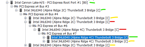 A pirossal jelolt reszeken: max 8 GT/s, current 2.5 GT/s - jo lenne ha 8 GT/s lenne: ezen a vonalon, vagy epp pont itt van a videokartya.A kartya meg a kozvetlenul "felette" levo TB3 Bridge linkje 8 GT/s-en van.