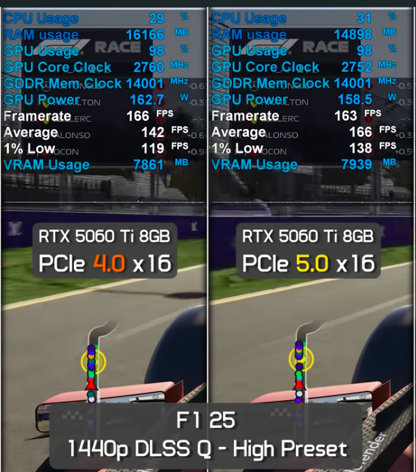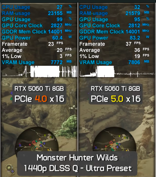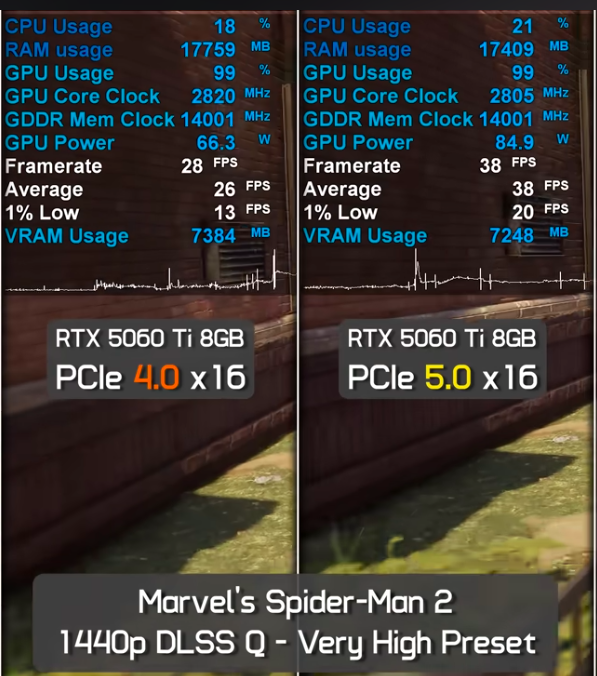 - RTX 5060 Ti 8 GB on PCIe 5.0: 34.0 FPS
