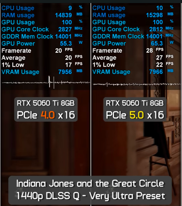 - RTX 5060 Ti 8 GB on PCIe 4.0: 4.8 FPS -