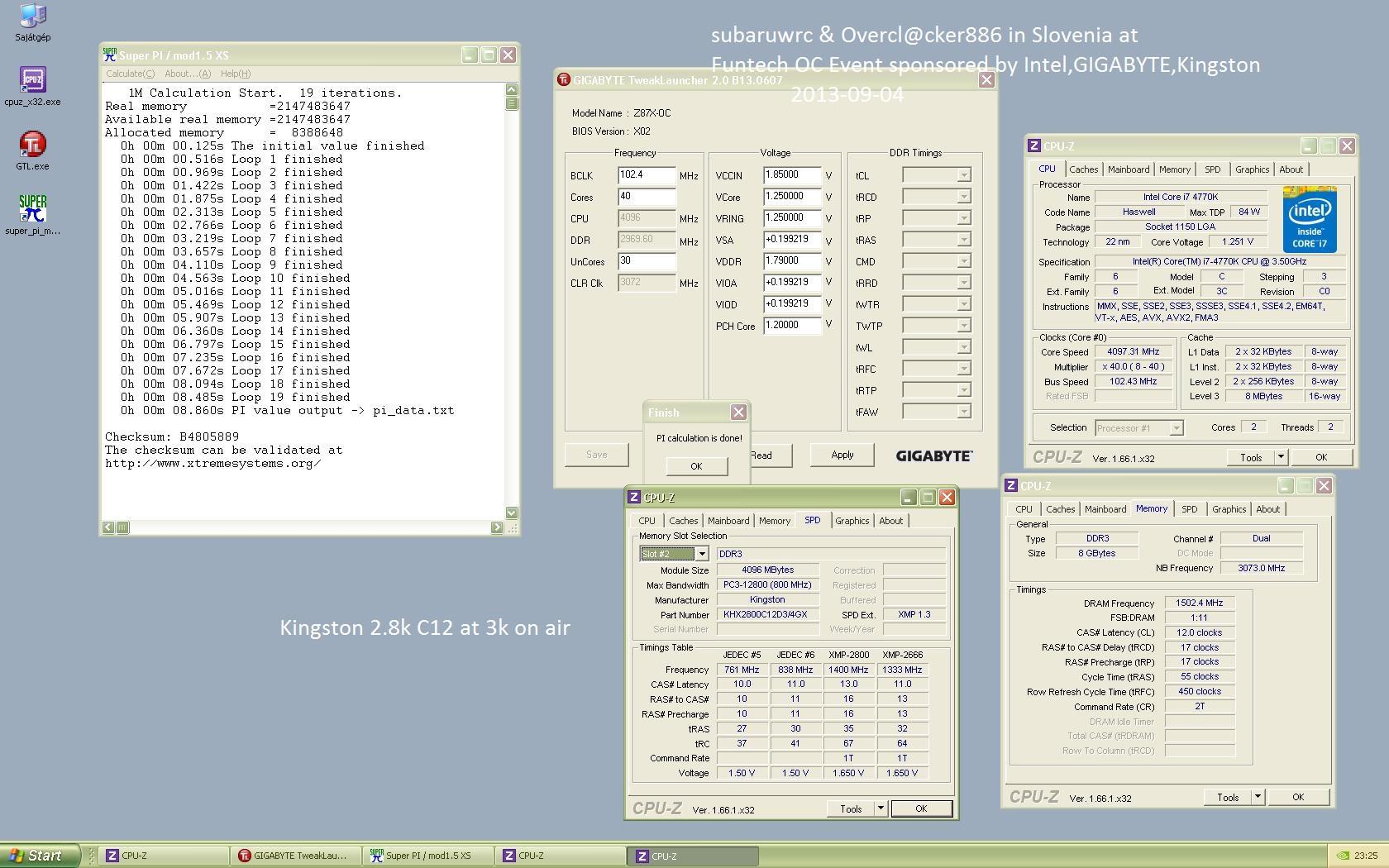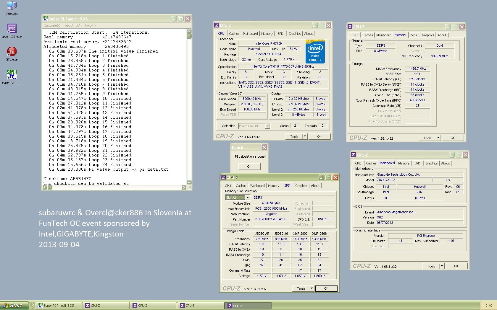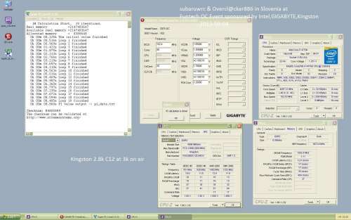 (cca 450km ) hogy a meghívásnak és a felkérésnek eleget téve fun jelleggel megmérkőzzünk de inkább csak közösen bencheljünk egyet az OC-lab 2 tagjával ( Hwbot 1.-2. ) Tiborral aki nem mellékesen az EK egyik mérnöke illetve Moonmannal aki nagy OC Enthusiast hírében áll. Az indulás előtti este hwboton átnéztem a lapjukat és el kell mondjam az ottani eredmények ( frissek ) nem teljesen tükrözik a tudásukat. Profik,és bár élvezték a hazai pálya előnyét valamint némi szerencséjük is volt tagadhatatlan hogy egy percre sem remegett a kezük, minden apró problémára villámgyorsan találtak megoldást, ellentmondást nem tűrően paszírozták ki a hardverből az utolsó tartalékot is. Számomra nagy élmény volt végre angolul is társalogni tuningosokkal, tapasztalatokat cserélni, sőt egy ritka pillanatban még egy jó ötletet is tudtam nekik adni ami egy minimálisan hozzájárult a nap végén elért 4000+mhz DDR3 órajel rekordukhoz.Tiborr és Moonman az első pillanattól kezdve közvetlenek voltak, kérdés nélkül segítettek bármiben, időt és hardvert ( hőlégfúvó, pendrive ) nem kímélve támogattak minket, de ez a Gigabyte és a Kingston részéről is elmondható hogy az Intelt ne is említsem. Jó élmény volt ilyen feltételekkel tuningolni, és bár az eredmények engem nem töltenek el elégedettséggel nagyon szívesen indulnék holnap reggel ismét benchelni a srácokkal.A teszt rendszereket Gigabyte Z87X-OC lap ( X02 bios ), bolti 4770K cpu, 8GB 2666 illetve 2800mhz-es Kingston memóriák, 128GB HyperX SSD-k és csapatonként egyedi hűtési megoldások alkották. Tápegységekből CoolerMaster és Enermax példányokat használtunk ezek a csapatok sajátjai voltak.