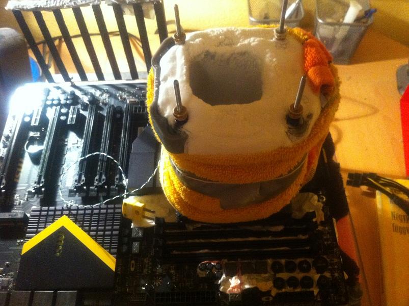 (Giga EP45-UD3P, világbajnok E8400-am, 2x1GB CellShock 1000CL4, TX750 táp, 60gb Agility 3 OCZ SSD, TinyXP tweakelve), ez alkalommal már működő alaplap van alatta, lehet a CPU feszt is állítani, valamint a szigetelés problémája is megoldódott. 10 óra folyamatos terheléses üzem mellett sincs semmi nedvesedés. A művészgyurma és a 2 centi vastag armaflex megtette hatását.