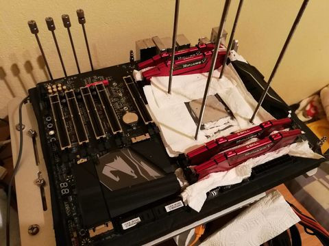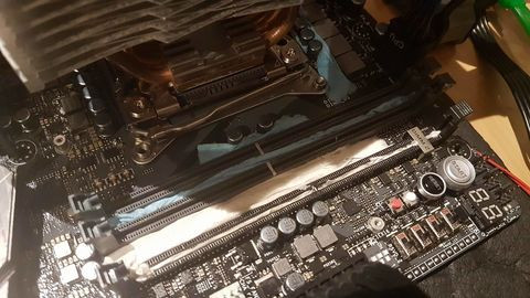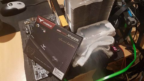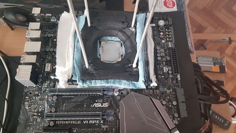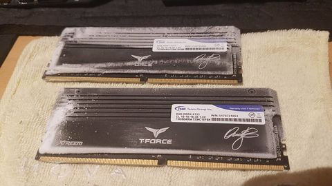 tegnap nekiláttam a maradék néhány liter nitroval tesztelni az OPB-től kapott különleges limitált 4133c18 Team Group B-die kitet... sajnos mint kiderült ezek nem low cas-re lettek binnelve, igy léggel a 12-12-12-es szokásos B-die időzitések nem mennek neki egyáltalán... kicsit csalódottan de megirtam neki, hogy ez a kit nem a legjobb... és megkaptam a választ, hogy ez a pcb amit ezekhez a kitekhez használtak a KO8495A a legjobb ln2-re... uh ennek a hirnek a hallatán adtam neki egy esélyt bizonyitani...azon agyaltam, hogy a teamgroup bordái nagyon frankó masszivak, leginkább a ddr3-mas korszak cellshock-jaira emlékeztetnek, elég macerás lett volna a leszerelésük (imbuszcsavarok kivétele, melegités aztán ovatos lefeszegetés) és a kialakitása tökéletesen alkalmas az EK rampot direktben történő felhelyezésére. szóval szépen beraktam őket a helyükre, körbeszigeteltem és egy adag pasztát kentem a ramok tetejére majd a saját súlyánál fogva szépen rányomkodtam a rampot kád részét amig felfelé mozgatva a paszta lent nem tartotta szóval a kontakt megfelelő lett.