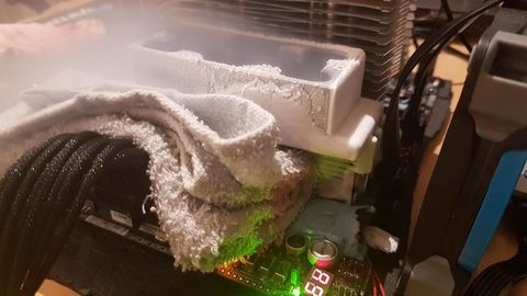 na mondom itt az ideje kipróbálni a fűtőszálakkal megtámogatni a lap túloldalát közvetlenül a ramok mögött igy csökkentve a lap jegesedését.szóval elég jól működni látszott a megoldás, szép lassan lementem a ramokkal full potra, mig a ramslotok mellett a lap teljesen jegesedés mentes maradt. gyakorlatilag ez a módszer olyan szinten leegyszerüsitette a ram nitrozást, hogy gyerekjáték szintre esett. semmi postkód hiba a ramokkal, semmi jegesedés, vizesedés csak arra kellett figyelnem, hogy tele legyen a pot.