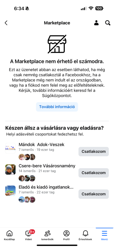 A Facebook Marketplace egyik percről a másikra azt írta ki, hogy nem elérhető számomra. Több hirdetésem is volt.