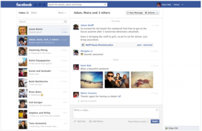 Komolyan gondolta Zuckerberg anno, amikor kijelentette, hogy közösségi oldal üzenetküldő szolgáltatását egy teljes értékű email-klienssé kívánja alakítani. Ennek a tervnek egy újabb lépését láthatják azok a felhasználók, akiknél már aktiválták a legújabb fejlesztéseket. Az újragondolt kezelőfelülettel a Facebook chatkliense egyre jobban hajaz egy klasszikus elektronikus üzenetküldő szolgáltatásra: az új és eddigi beszélgetések bal oldalt, egy görgetősávban lesznek láthatóak. Egy címzettre rákattintva, a vele folytatott beszélgetés nem egy új lapon, hanem a sávtól jobbra, középen jelenik majd meg.