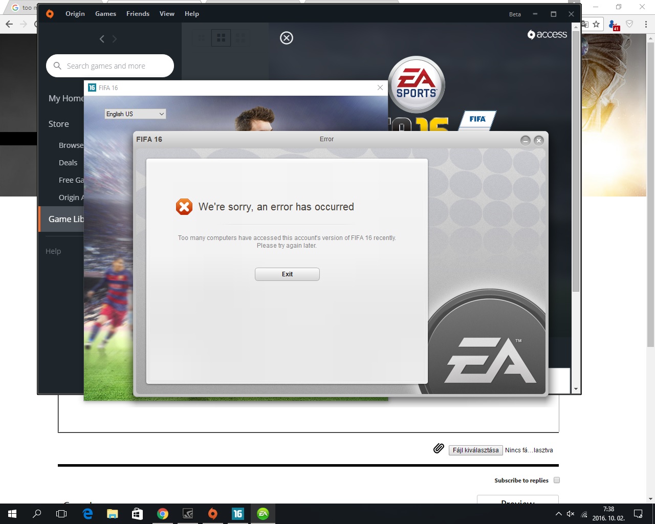Ezt kapom az arcomba. Ha megkerülöm a fifakonfigot és direktbe indítom akkor is ezt írja. Ráadásul csak ez csinálja semmi más. Újraraktam az origint és a magát a játékot is. Letöröltem 3 win frissítést ami okozhatja, sfc /scannow nem talált semmit. Nincs több ötletem. Valaki találkozott hasonlóval? -