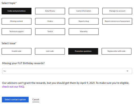 "Hi [Player Name],Our advisors can’t grant FUT Birthday rewards, you should get them when you log in between March 26 and April 9, 2021, as long as you’re eligible to get them.