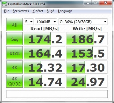 De visszaviszem neki, mert bár láthatóan pöpecen fut rajta a rendszerem, amit rátelepítettem, de mindegyik teszt ilyen siralmas számokat dob rá...És mivel az SSD meggyőzőtt, veszek inkább 1 újat, minthogy visszaálljak a 7200 rpm -re, bármennyire is elfoglal egy SATA slotot a gépemben a tárhely rovására :-D