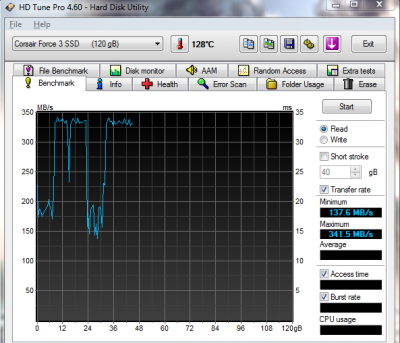 Viszont mikor HD-tune-ban csinálok egy olvasás tesztet elég elkeserítő kép fogad:Az egy dolog, hogy meg sem közelíti a gyárilag megadott 550/500 MB/s sebességet, no de az, hogy még ilyen mértékben ugrál is...