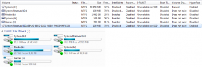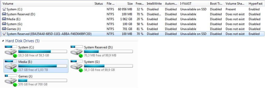 " nevű 100MB méretű partíció, ami eddig nem volt látható a My computer-ben. A Diskeeper szerint létrejött egy rejtett 100MB-os partíció is hasonló néven: "System Reserved (hosszú kód)". Előbbit HDD-ként, utóbbit SSD-ként értelmezi.
