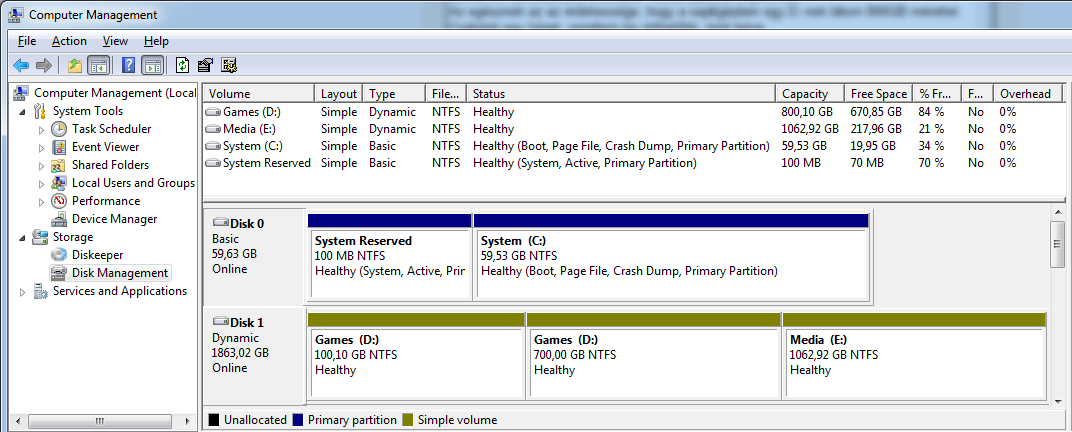 - a D: két részre szakadt a Lemezkezelő szerint: egy 100,1 GB-os részre D: név alatt (korábbi rendszer+100MB) és szintén D: elnevezéssel a 700GB partíció is jelen van, amihez csatoltam őket. A sajátgépben viszont egy D:-nek látok 800GB mérettel.