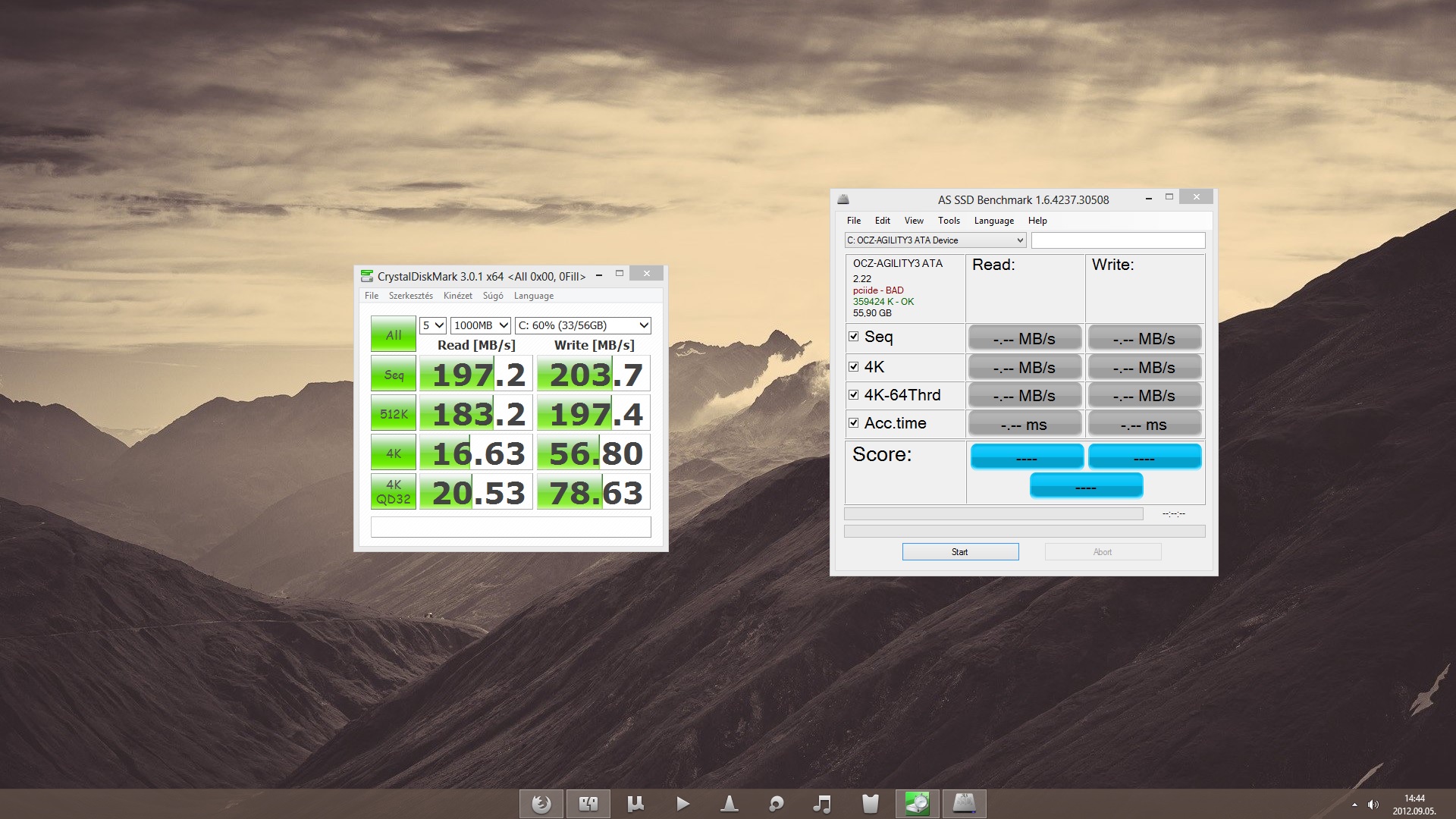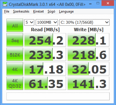 Crystaldiskmark progival, 0Fill beállítással mérj, hogy megkapd a gyárihoz közeli értékeket. Akkor látod majd a sata2 és sata3 közötti különbséget. Egy AS Ssd Benchmark képet tehetnél fel, az a bal felső sarokban megmutatja, hogy rendben van-e az alignálás, illetve jó-e az ahci driver.