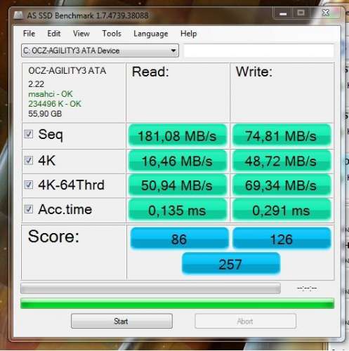 A Samsung 830 64G-s max 64MB/s-el tudna írni akkor is, ha AHCI porton lenne, mindössze 16K IOPS van megadva... Agility 3 meg 50K IOPS, még szép, hogy IDE módban, átalakítóval is gyorsabban szedi a talpát...