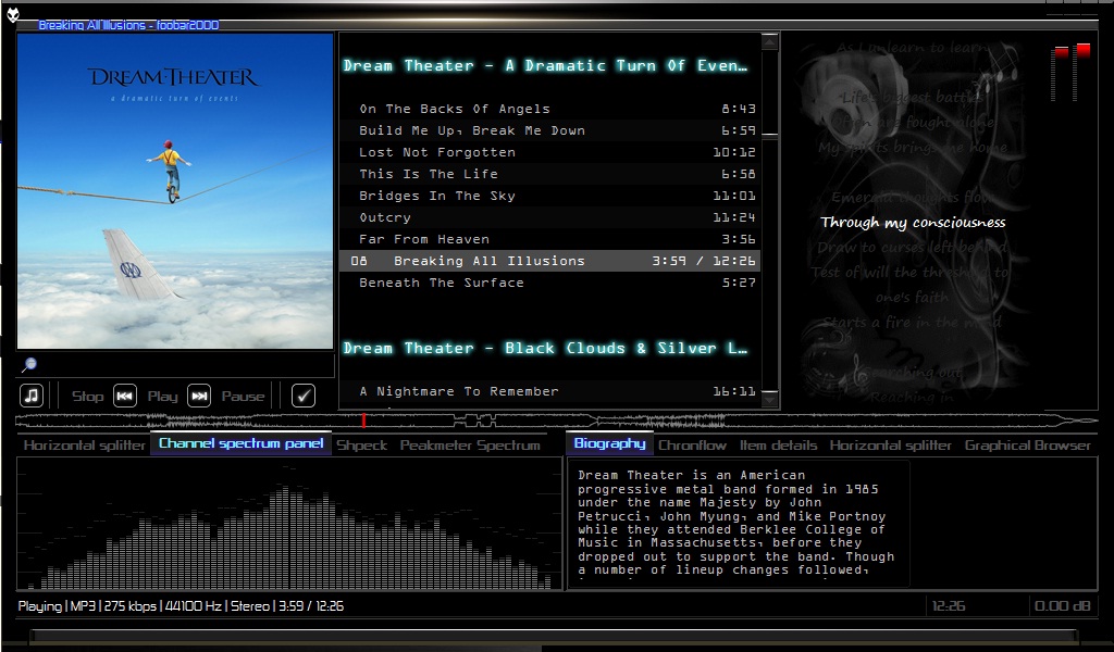 1.1.8 verziojú foobar-on használom. Minden beállítás (colums UI, playlist, channelspektrum, stb.) megtalálható a csomagban, de természetesen úgy változtatod, ahogyan csak szeretnéd. Átméretezés, színezés, áthelyezés...