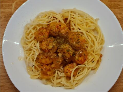 Fagyasztott garnélát használtam (Lidlben van 3 féle is), addig kell közepes lángon pirítani, míg rózsaszínű nem kezd lenni, néhány perc mindkét oldalra elég. Utána mehet bele kis víz (nem kell sok, mennyiségtől függően 1-2 dl) vagy hús alaplé és ilyenkor mehet bele a fűszer is, só, bors, gyömbér, chilli ízlés szerint. A mézet a végén tettem bele, mert sűrít és folyamatosan kóstoltam, inkább legyen benne kevesebb fűszer / méz, minthogy valamelyik túlsúlyban legyen. Mire megfől a tészta, ez is készen van.2-es verzió lehet a paradicsomos, én abba tettem bazsalikomot és rozmaringot.