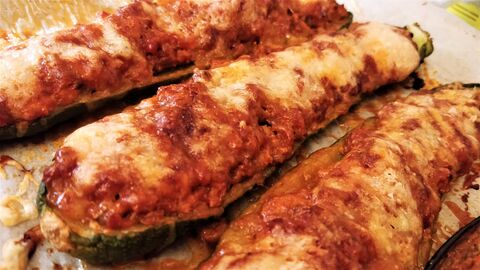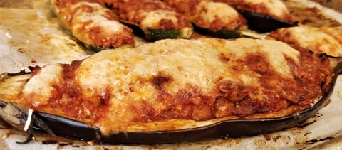 Apróra vágott karajt, cukkini és padlizsán kikapart belsejét hagymán megpirítottam, aztán hozzáadtam a fokhagymát, kevés fűszerpaprikát, sót, borsot, oregánót, kakukkfüvet, majd felöntöttem konzerv paradicsommal, és addig főztem, amíg be nem sűrűsödött. Ezzel a raguval megtöltöttem a kikapart padlizsánt és cukkinit(előtte besóztam őket), és végül sajtot reszeltem a tetejükre.