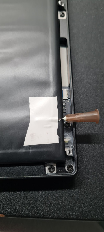 Szoval fogtam a legkisebb tut amit talaltam - az 1ml-es fecskendore valo, szerintem hajszalnal vekonyabb. Azt a sarkan benyomtam. Nem muanyag a boritasa, szerintem a fekete folia reteg alatt egy alu avgy egyeb viszonylag vastag fem folia van. Azt nem volt egyszeru atszurni, de megtettem. Mindket oldalon. Gazt kinyomtam a tun keresztul, aztan fecskendo ra, vakuumot csinaltam, tut kihuztam, a ragasztot ranyomtam. Most jo osszeaszottnak nez ki az akku, rasimul a kopenye ahogy kell.