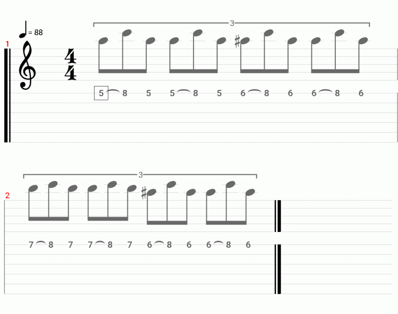 Ujjrend: 1, 4, 1, 1, 4, 1, 2, 4, 2, 2, 4, 2, 3, 4, 3, 3, 4, 3, 2, 4, 2, 2, 4, 2. Felesleges ujjemelések nélkül. Eredetileg legalábbis így találtam ki, hogy hatásos legyen.