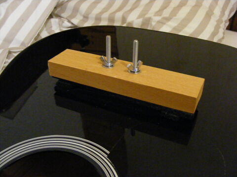 A szorításra kitaláltam egy egyedi megoldást, a csavarok átmennek a fedlapon a húrok furatain, a fa és a húrláb közé pedig gumidarabok kerültek, a széleknél természetesen vastagabban. Mondjuk klasszikus gitáron ez nem feltétlen alkalmazható, de mondom megosztom, talán hasznára válik valakinek.